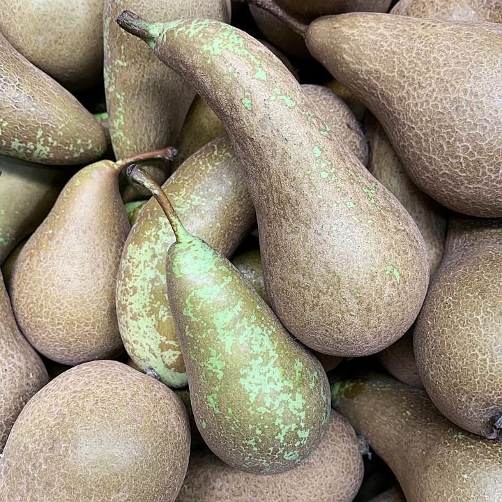 Die Früchte der Conference Birne sind meist grünlich mit brauner Berostung gefärbt. Die Schale der Birne ist im Vergleich zu anderen Birnen-Sorten härter und fester.