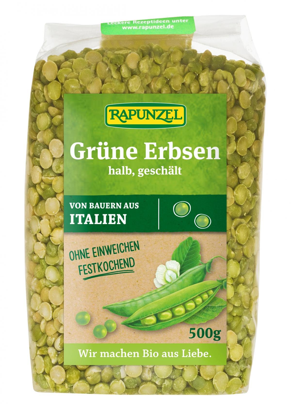 Vielseitige Hülsenfrucht - geschälte halbe grüne Erbsen sind der würzige und festkochende Klassiker für Eintöpfe und Suppen. Sie sind schnell zubereitet, da sie nicht eingeweicht werden müssen. Rapunzel engagiert sich seit vielen Jahren für den Anbau von Hülsenfrüchten in Europa. Denn der Anbau heimischer Eiweißpflanzen wie Linsen, Bohnen oder Lupinen trägt zu einer vielfältigeren Fruchtfolge und damit zur Erhaltung der Bodengesundheit bei. Leguminosen benötigen im Anbau keinen Stickstoffdünger und reduzieren so die Belastung des Bodens. Gleichzeitig fördern sie durch die Anreicherung von Luftstickstoff in ihren Wurzeln die Bodenfruchtbarkeit. Außerdem dienen sie als wichtige Nahrungsgrundlage für Bestäuber wie beispielsweise Bienen.