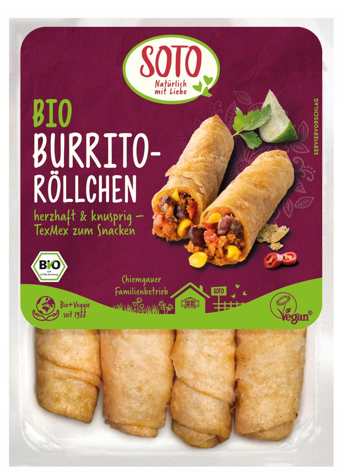 Fiesta Mexicana für Zuhause: Die neuen Bio Burrito-Röllchen mit einer würzigen Füllung aus Kidneybohnen, Mais, Tomaten und roter Paprika nehmen Sie mit auf eine kulinarische Reise nach Südamerika. Dünner Knusperteig sorgt für den beliebten Crunch. Die Röllchen sorgen mit ihrer mexikanischen Note für sommerlichen Genuss in der heimischen Küche und auf dem Grill.